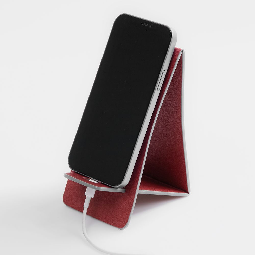 Складная подставка для телефона с вырубкой под шнур зарядного устройства. Выполнена из материала Petrus.