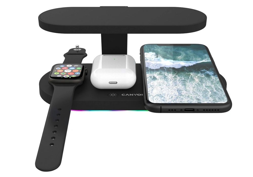 Беспроводная зарядная станция Canyon WCS 501 — новый подход к зарядке гаджетов. Вы сможете безопасно заряжать одновременно три устройства без провода и одно устройство через зарядный кабель.