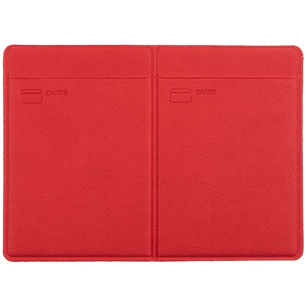 Обложка из искусственного материала, имитирующего сафьяновую кожу, с четырьмя карманами: для водительского удостоверения, свидетельства о регистрации, денег и пластиковых карт.