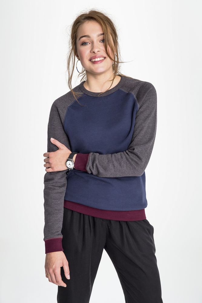 Трехцветный свитшот в стиле 80-х с рукавом реглан. Ворот, манжеты и низ в резинку 2x2.