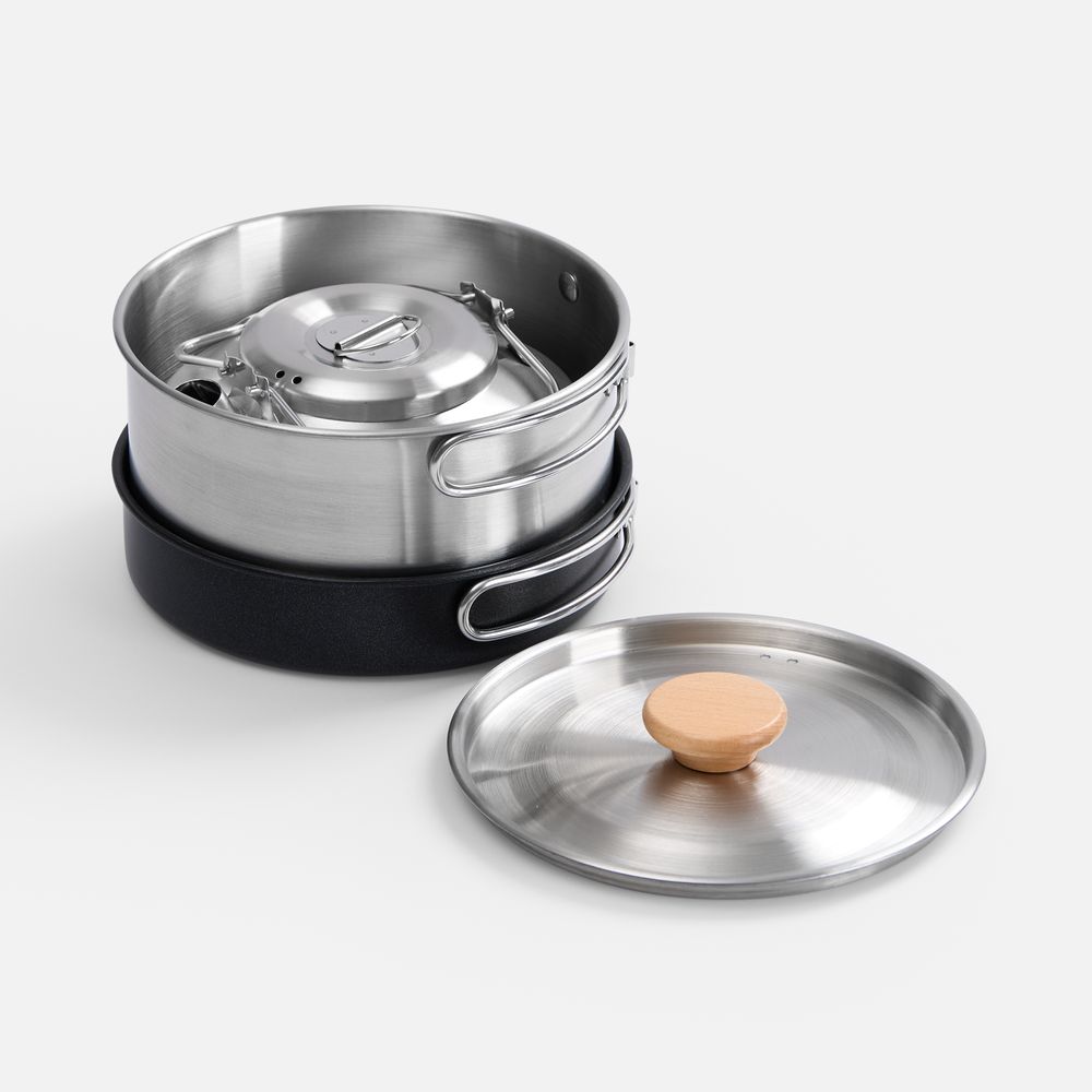 Набор компактной посуды Stackado незаменим для пикников, кемпинга, альпинизма, рыбалки и других приключений на свежем воздухе. В набор входят кастрюля, сковорода и чайник — все необходимое для полноценного приготовления блюд: от утреннего кофе до обеденного супа и ужина с жареными овощами.